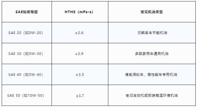 HTHS的單位是mPa·s(毫帕秒),數值越大,代表機油在高溫高壓下的油膜強度越高。根據行業標準(如SAE J300),不同SAE粘度等級對應的HTHS最低要求如下: