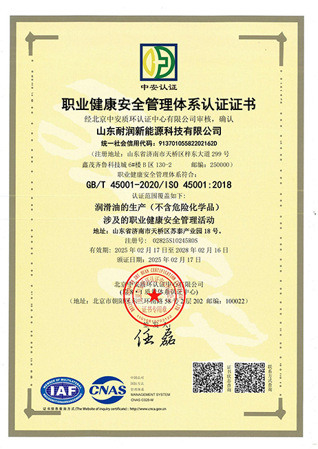 ISO 9001 作為全球廣泛認可的質量管理標準,要求企業建立并有效運行一套完善的質量管理體系,涵蓋從原材料采購、生產過程控制到產品交付及售后服務的全過程。耐潤潤滑油成功通過此項認證,充分彰顯其在產品質量管控層面已達國際先進水準。