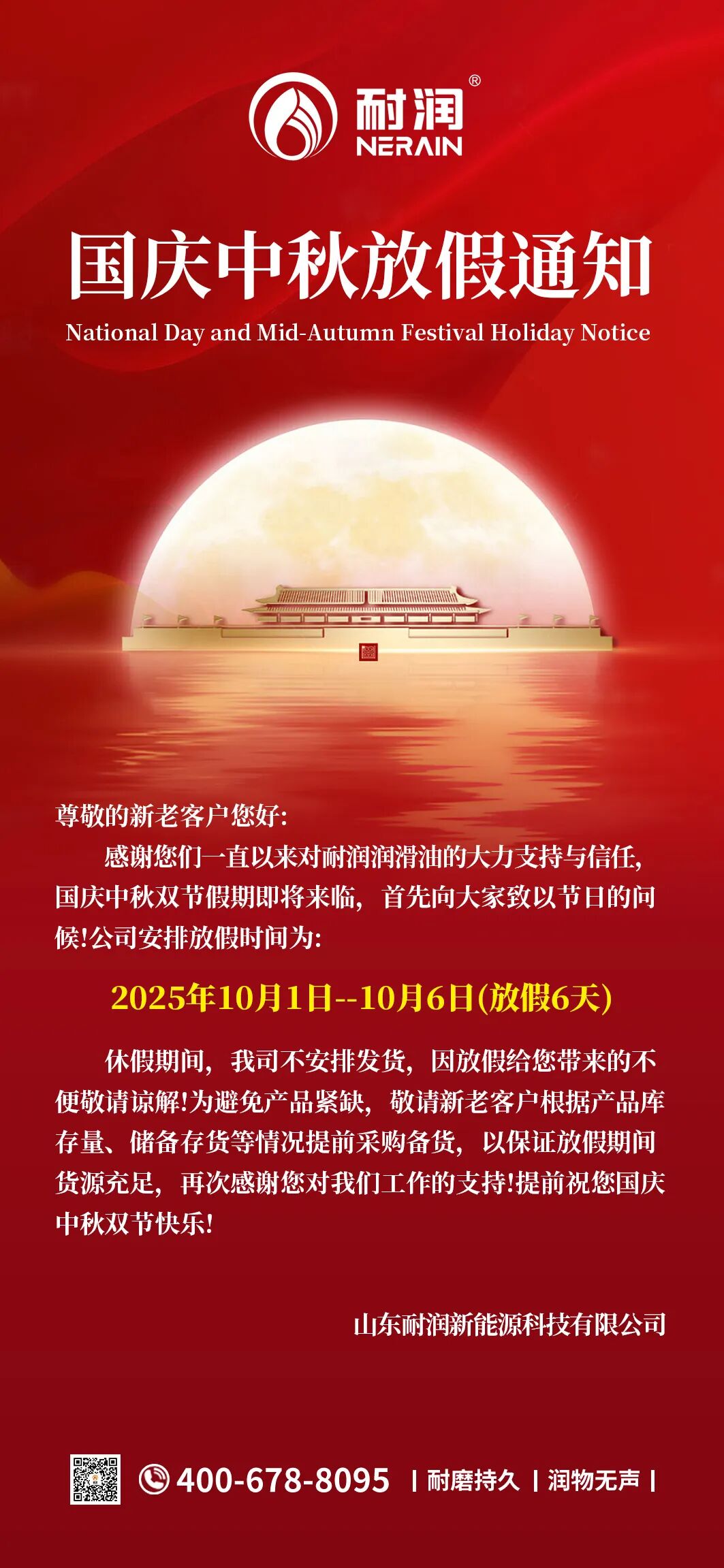 雙節同慶 | 耐潤潤滑油2025國慶&中秋放假通知!